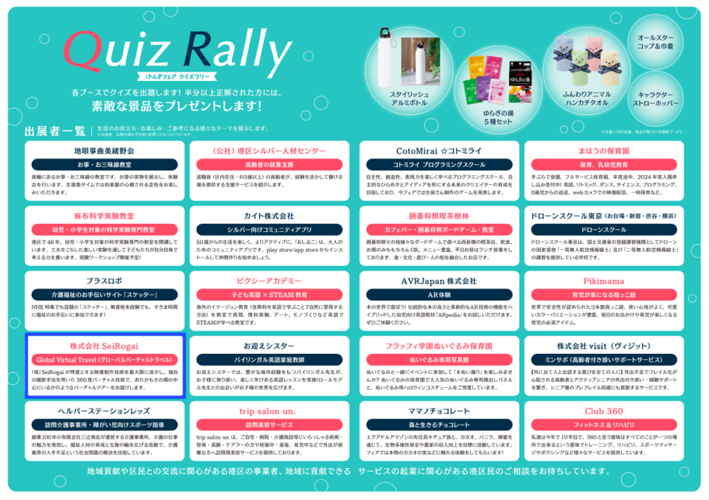 SeiRogaiは、港区立産業振興センター主催の第7回港区地域げんきフェアに2023年10月8日(日) に出展します。イベントではSeiRogaiのVRツアーサービスのご紹介、VRツアーの体験もご提供します。